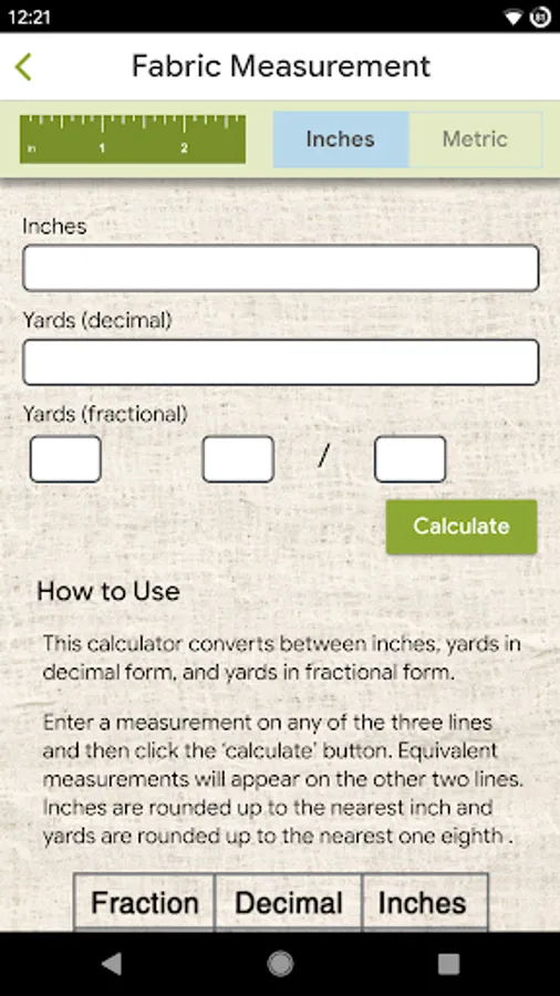 Fabric Measurement Converter: Converts between measurement in decimals and fractions.