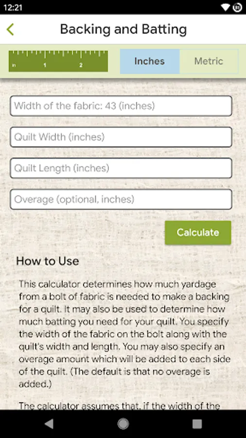 Backing and Batting Calculator: Determines how much yardage from a bolt of fabric is needed to make the backing for a quilt.
