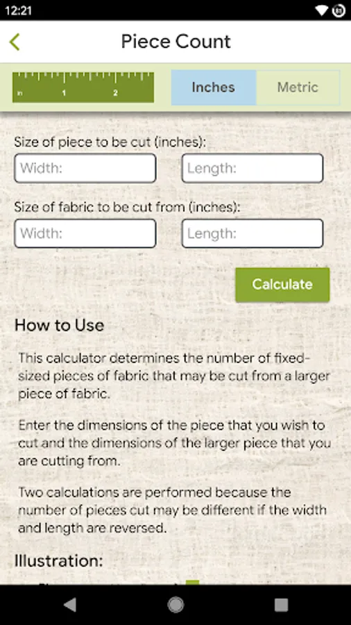 Piece Count Calculator: Shows the number of fixed-size pieces that can be cut from a larger piece of fabric.