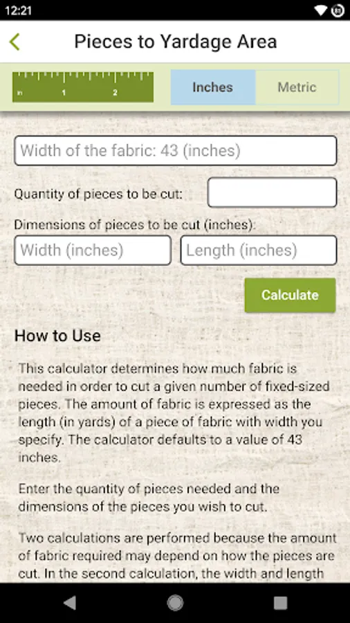 Pieces to Yardage Area Calculator: Indicates how much fabric is needed in order to cut a given number of fixed-size pieces.