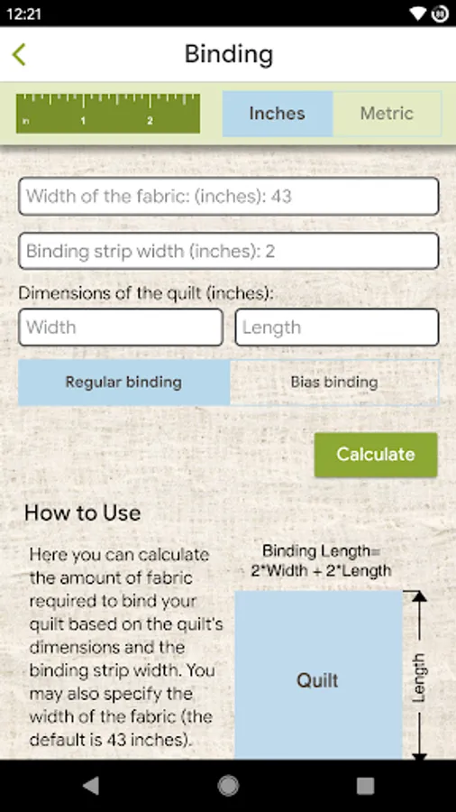 Binding Calculator: Tells you the amount of fabric required to bind your quilt, based on the quilt’s dimensions and the binding strip width.