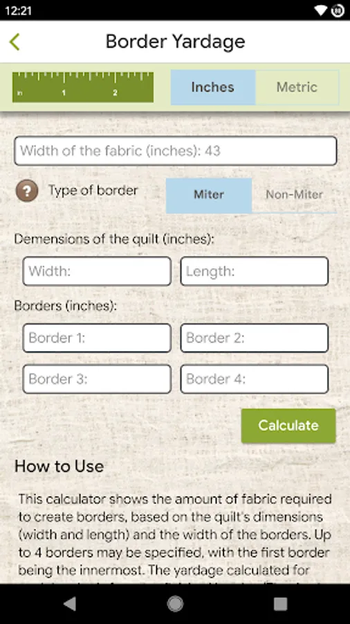Border Calculator: Shows the amount of fabric required to create borders, based on your quilt’s dimensions and the width of the borders.
