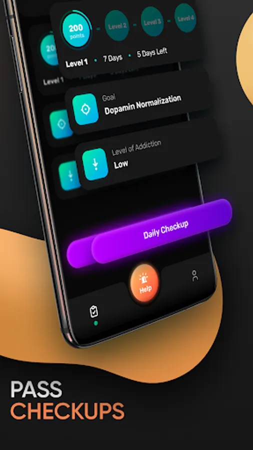 A daily survey in which we ask the user 2 questions about watching porn. If the answer to both questions is “no,” you get 100 points. If at least one is “yes,” your progress is reset to 0, and your no fap journey continues.