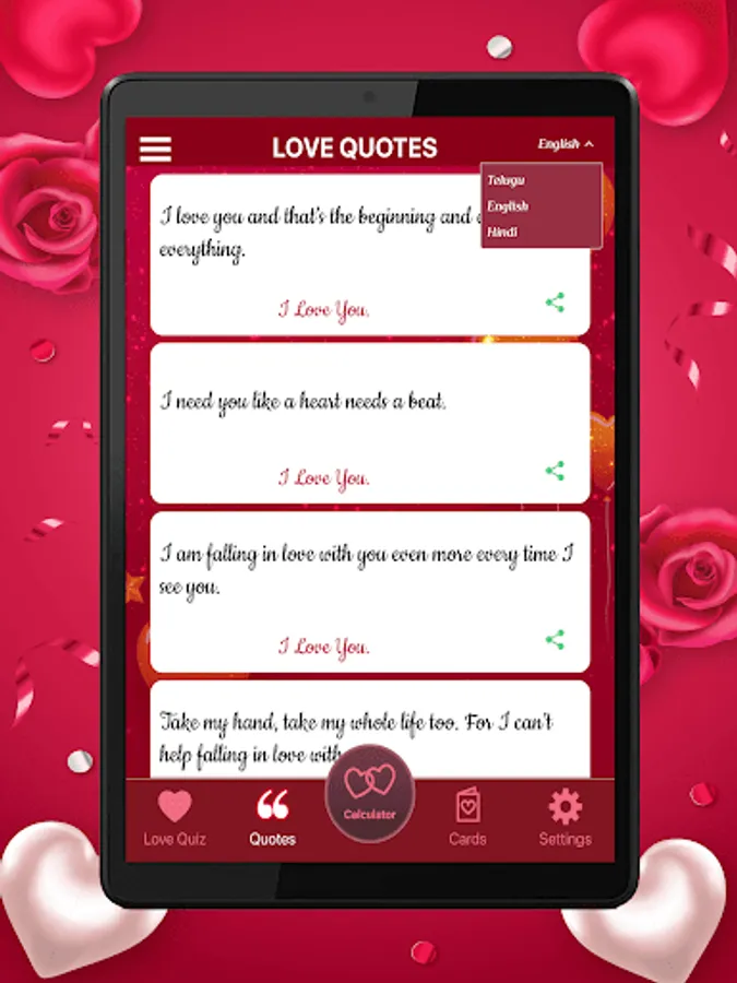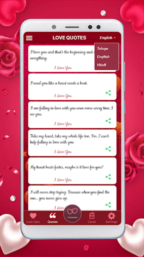 - Love Quotes available in 3 languages English, Telugu, Hindi.