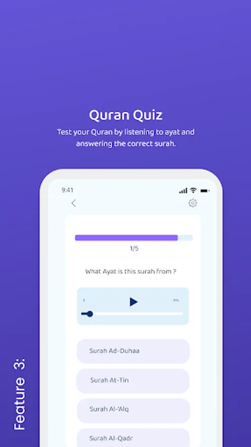 You will be provided with questions about the pillars of Islam, the Prophet and his companions, Hajj (pilgrimage to Mecca), fasting in Ramadan, and much more about Islam for you to answer. This also includes Quran audio verse where you have to answer the name (Surah) of the audio verse.