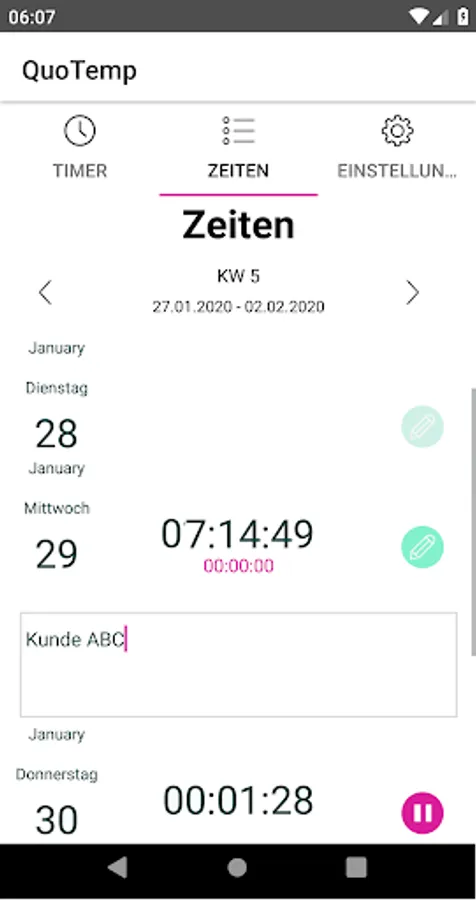 Note: A full license is required to evaluate the times. You can purchase this at www.quotemp.de. With this license it is possible to evaluate the hours of all employees and to configure the app.