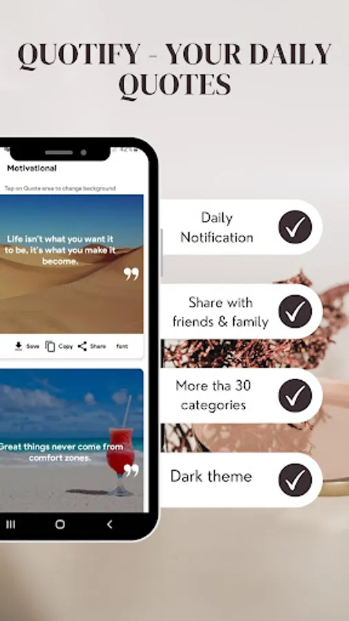 🌟 Vast Collection of Quotes: Explore a treasure trove of carefully curated quotes spanning multiple categories, including motivation, inspiration, wisdom, success, life, moving on, anniversary, angry, love, father's day, mother's day, friendship, birthday, and many more!. Whatever you're feeling, we have the perfect quote to match your emotions.