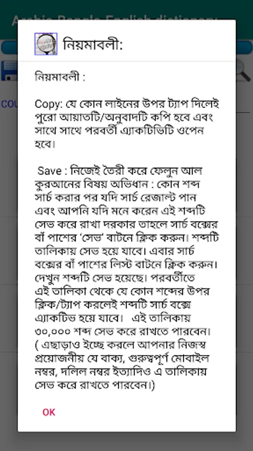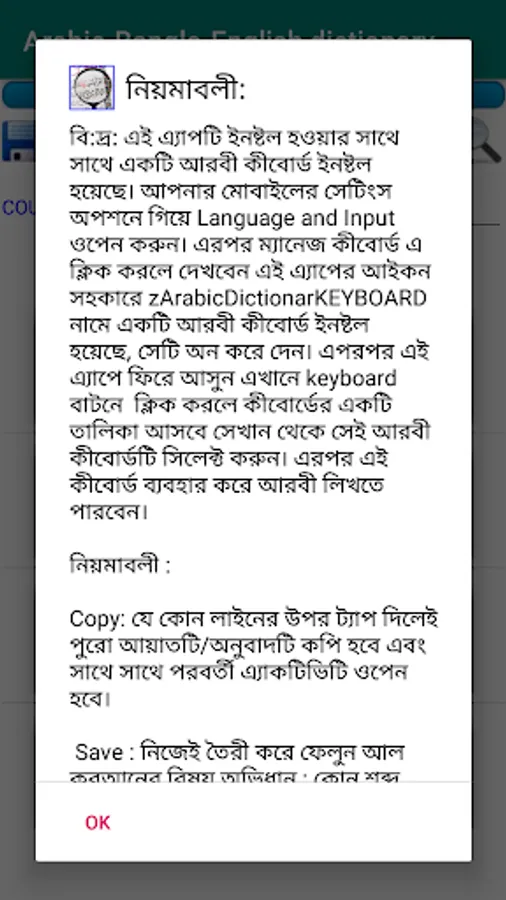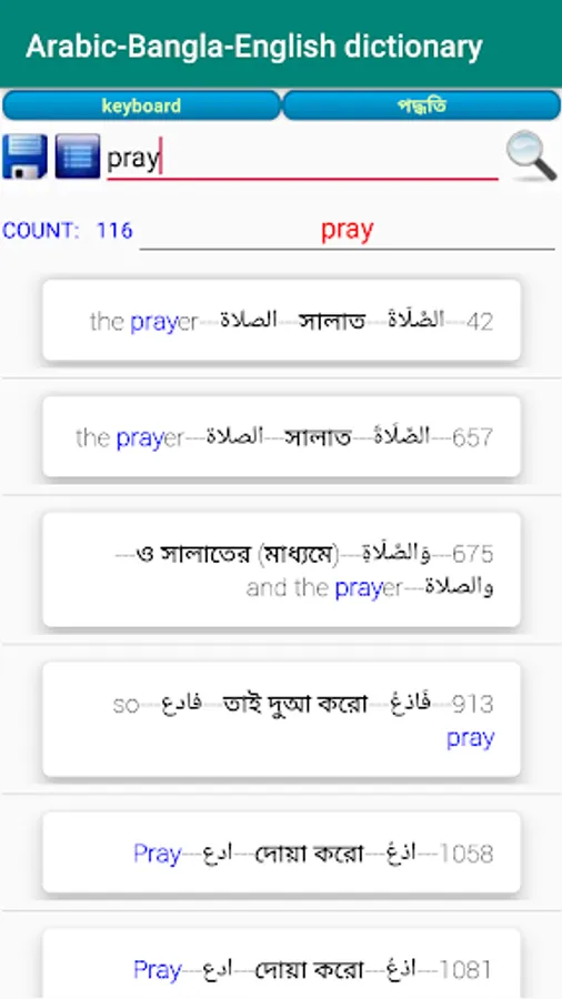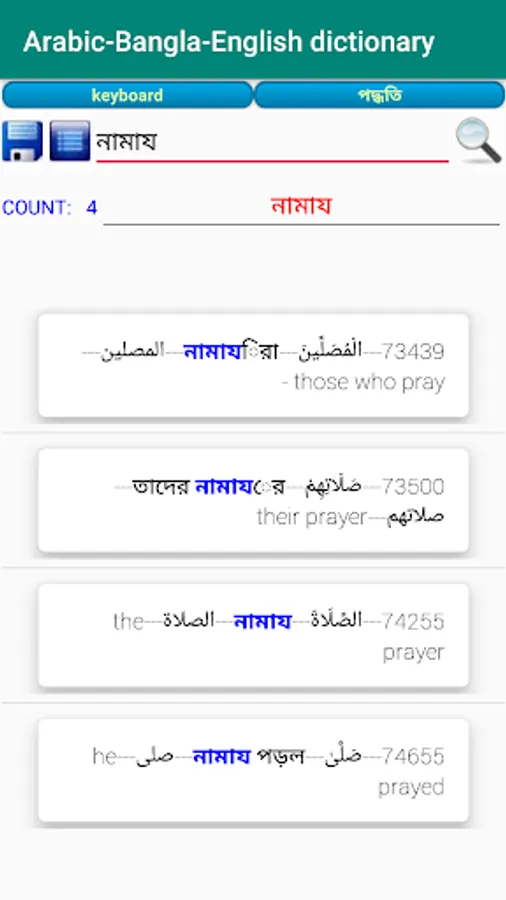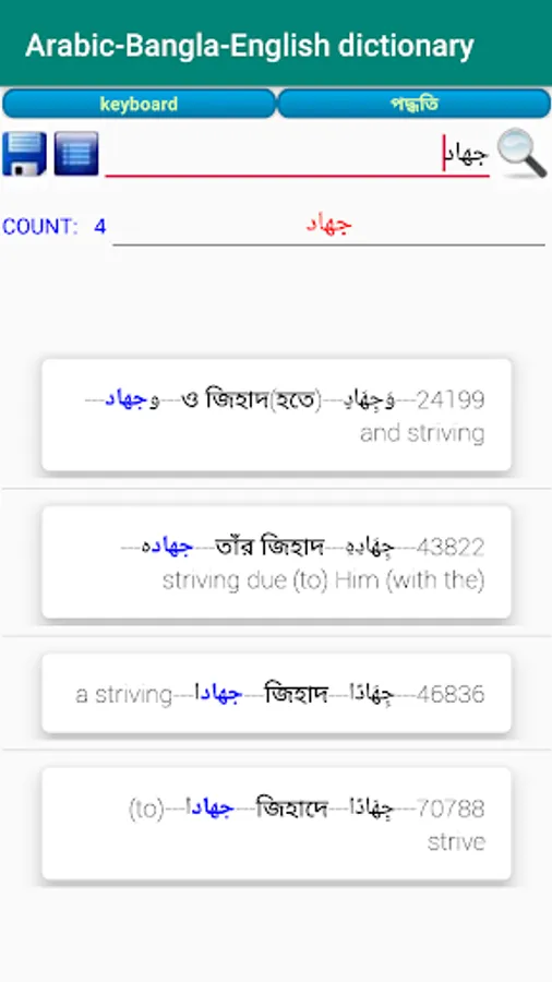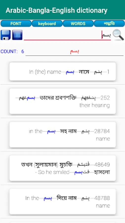 About 77000 Arabic Words, About 77000 Bengali Words, About 77000 English Words . Built in Arabic Keyboard for Arabic Search, Bengali and English Search Enabled, Arabic Dictionary and Word meaning According to the Exact Location in Alquran of the word. Words are serialized according to the location in Alquran and word numbering provided.