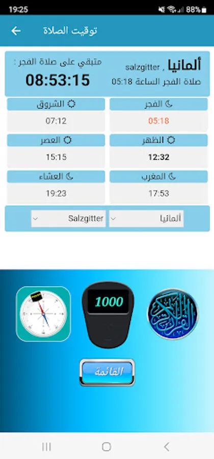 The application of the Noble Qur’an, the Noble Qur’an, the direction of the qiblah, the electronic rosary, prayer timings, prayer timings according to the city.