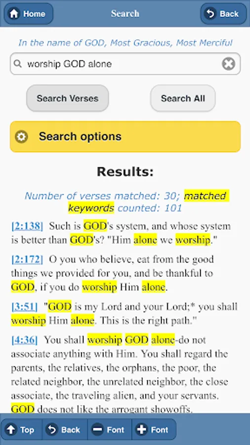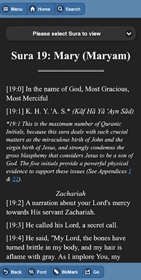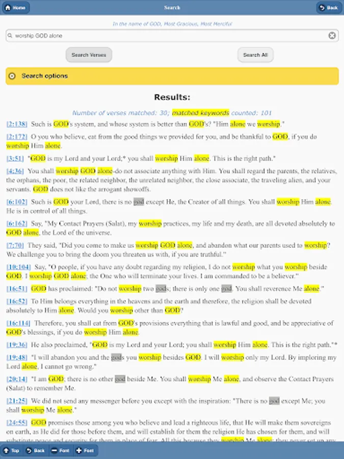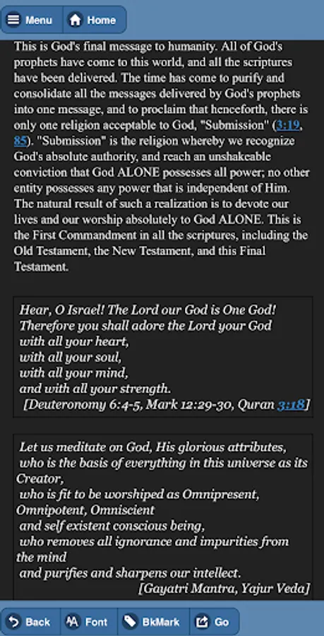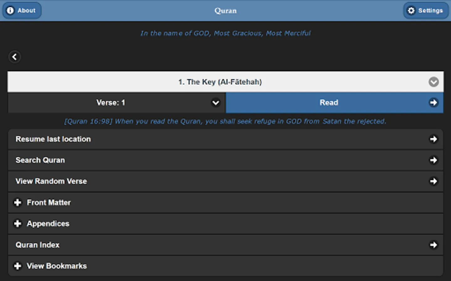Settings allow you to choose between day and night colors (i.e., white or black backgrounds) or increase font sizes for readability. Scroll to verses or tap (one-handed use) for next page (or swipe).