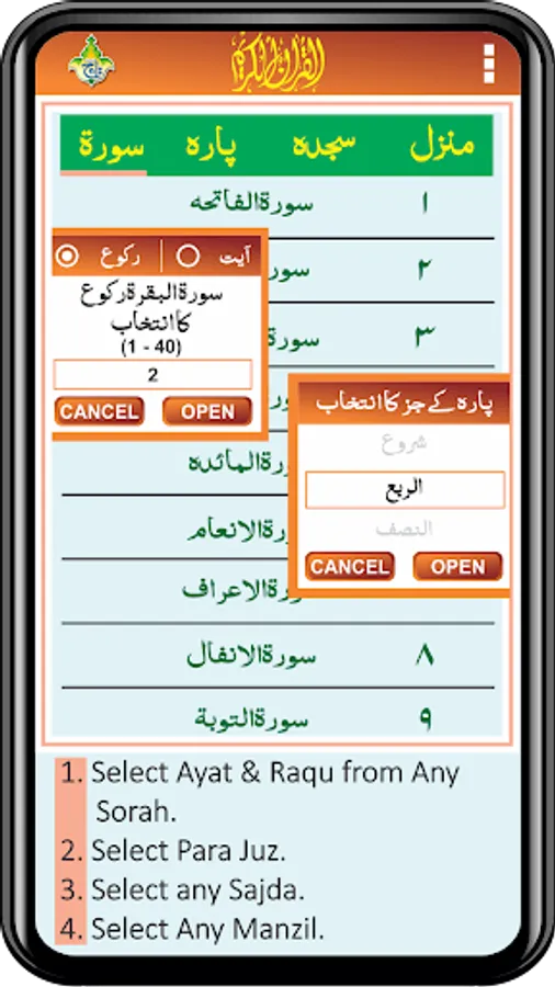• Search with PARA, SURAH, AYAT, ROKU, MAZIL & SAJDA,