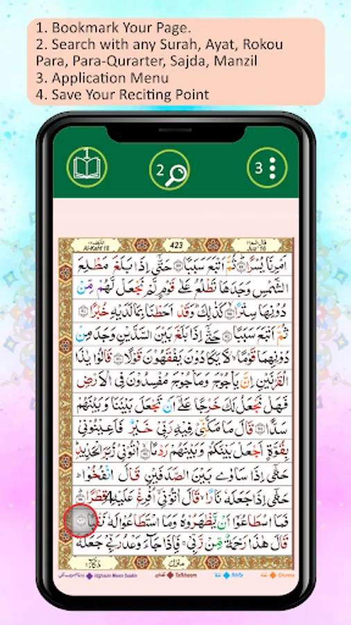 You can search The Noble Quran by Parah, Surah, and Ayat (ayah) and learn The Quran Tajweed in easy way. In Quran Taj Company 13 Lines, you can also save your Surah or page with unlimited bookmarks. While reciting The Holy Quran just tap the bookmark icon in quick toolbar to save the current Quran page plus you can search for particular ayah inside the application.