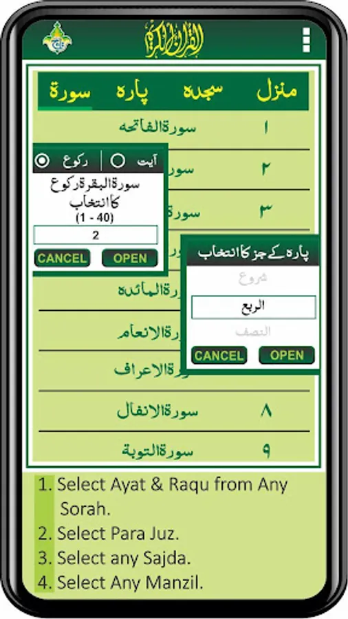 • Search with PARA, SURAH, AYAT, ROKU, MAZIL & SAJDA,