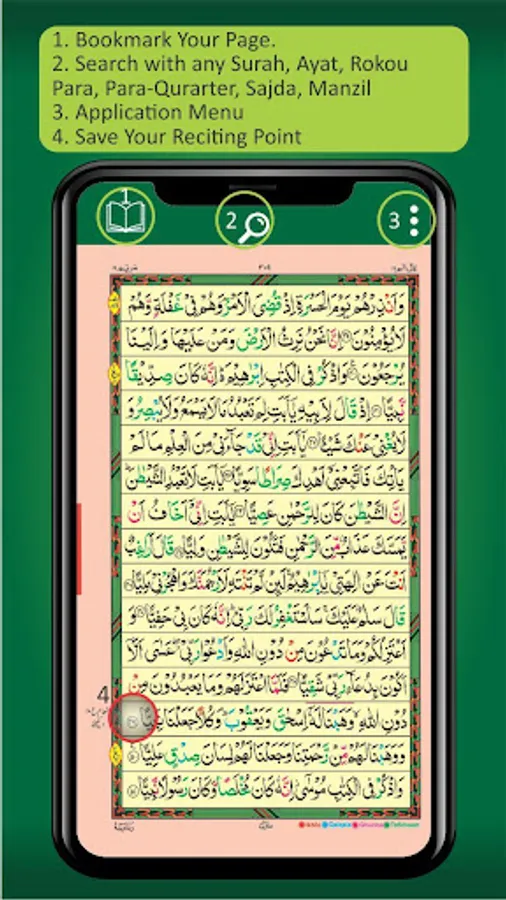 You can search The Noble Quran by Parah, Surah, and Ayat (ayah) and learn The Quran Tajweed in easy way. In Quran Taj Company 15 Lines, you can also save your Surah or page with unlimited bookmarks. While reciting The Holy Quran just tap the bookmark icon in quick toolbar to save the current Quran page plus you can search for particular ayah inside the application.