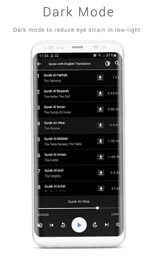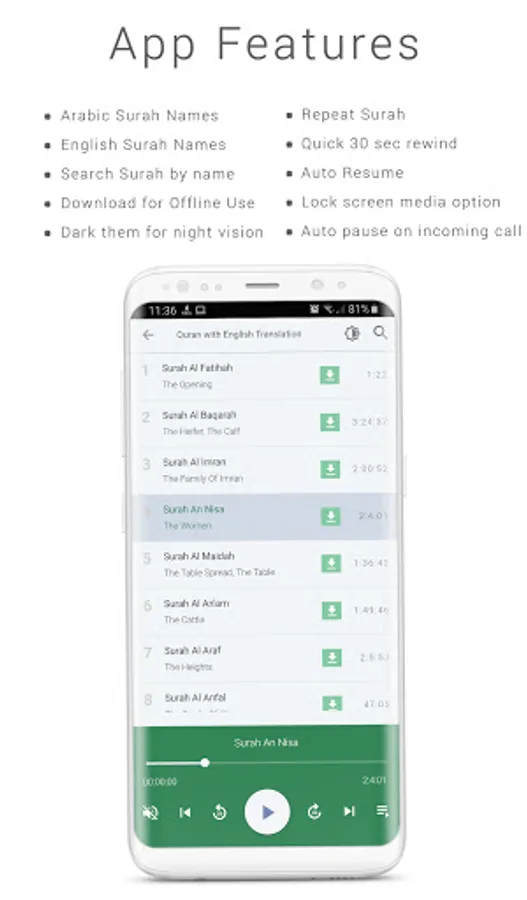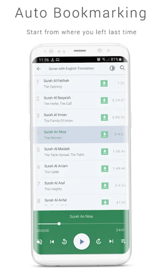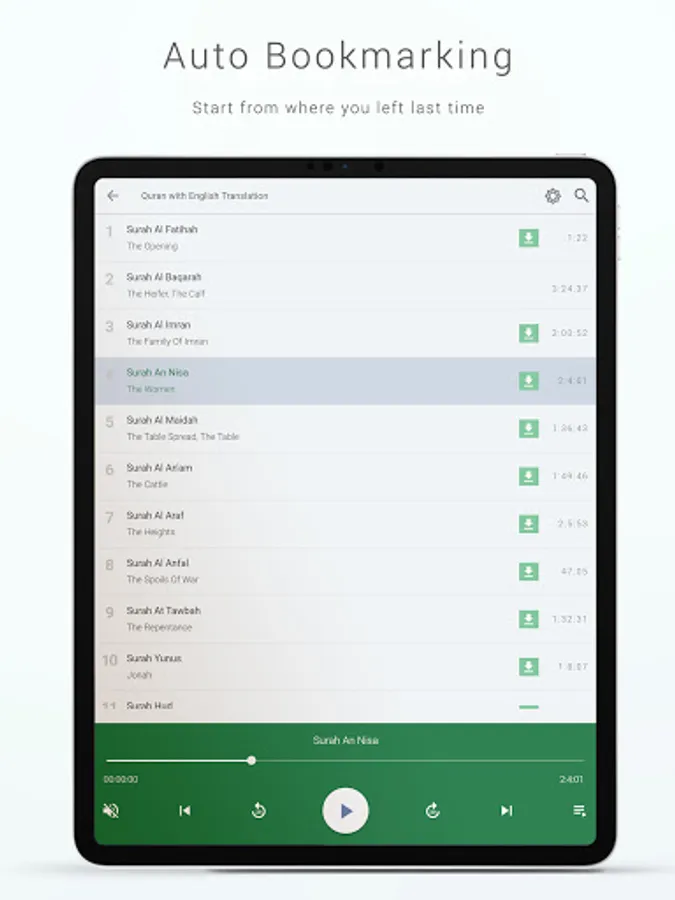 "Mobi Quran" is a specially designed app for Muslims who love to listen to the audio Quran. There are many apps for reading the textual version of the Quran but very few for listening to the audio version. Our main focus is on app usability and surah bookmarks and auto-resume where users left listening.
