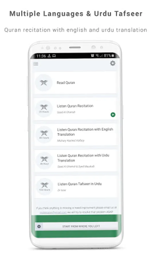 We have launched this app to ensure users have the best pocket Quran with Urdu translation and Tafseer by Dr Israr Ahmed. You can listen to Surah by Surah of all Quran.
