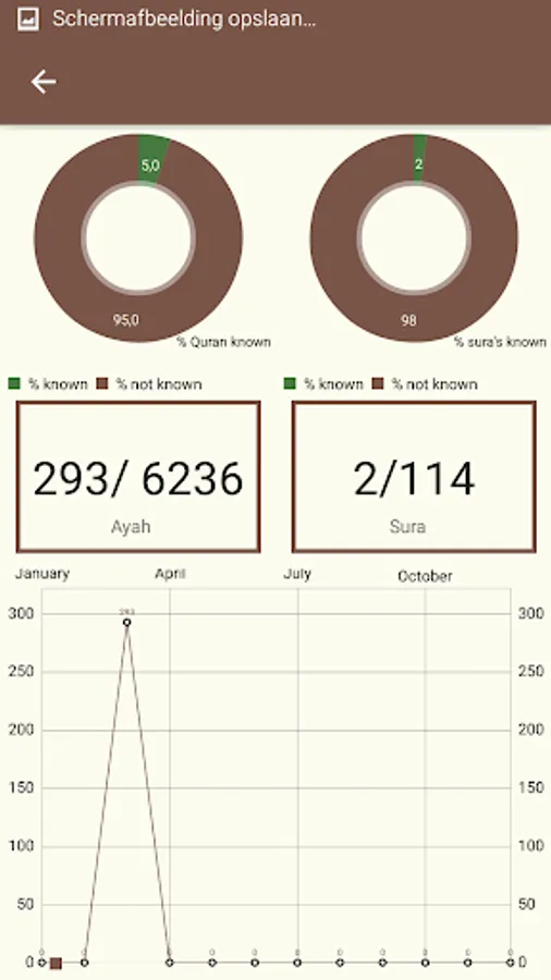 When you are in the main menu (where you can choose surahs) on the top right corner you will see a pie chart icon. If you press this icon you will be leaded to the progress page. This page contains the statistics of you memo rising Quran. We have included how much surahs and ayahs of the Quran you have memorized. And in how much time and When You have done this. Try out the progress page yourself once you click the pie chart icon!