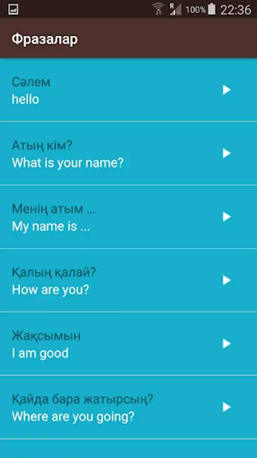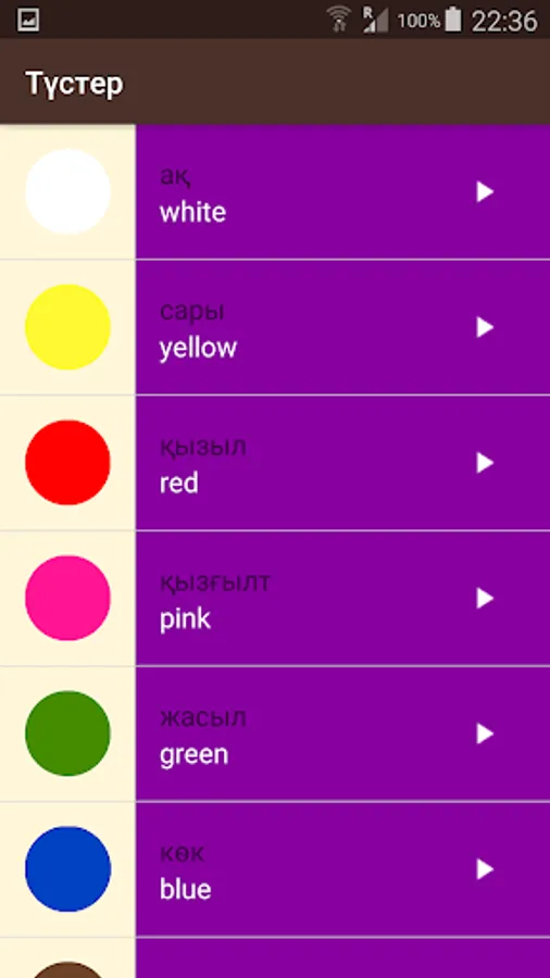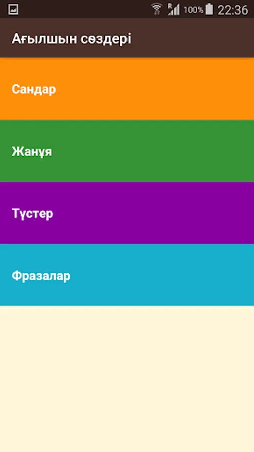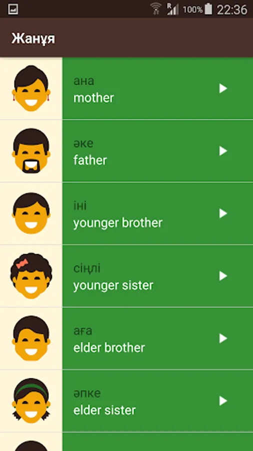 Sandar, tүster, zhanұya mүshelerі zhane keybіr frazalardyң aғylshynsha balamasy. Әr audarmanyң үstіne basқanda onyң aytyluy estіledі.