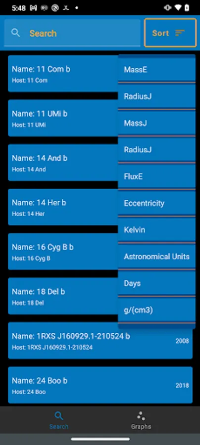 Using the latest data from Caltech's list of planets, browse, sort, and search over 4000+ planets. Organize the list of known planets by various attributes such as Period, Density, or Radius. Compare various attributes of the exoplanets in a custom scatter plots.