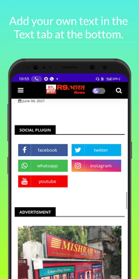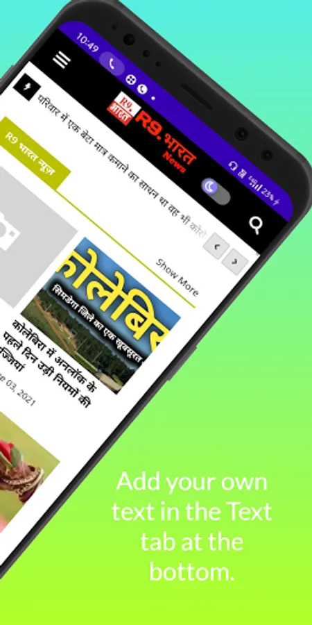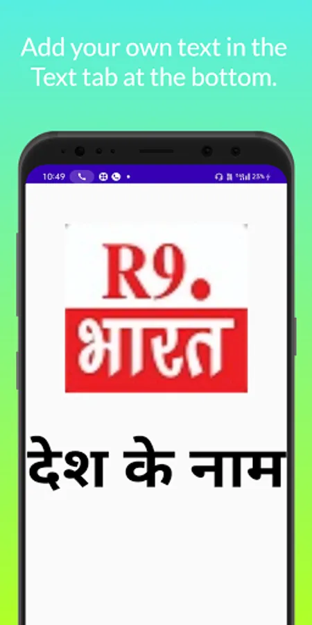 R9. भारत चैनल पर स्वागत है आपका ,यह एक हिंदी न्यूज़ चैनल है जो देश दुनिया के हर गर्म मुद्दे को आपकी स्क्रीन पर परोसता है , दिल्ली-मुंबई हो या गांव-गली की बात , हर नया मुद्दा दिखेगा साथ साथ। राजनीति , देश -दुनिया ,खेल मैदान , मनोरंजन तड़का , बहस संग्राम या फिर हो कोई सनसनी खेज मामला देंगे आपको सबसे सटीक विश्लेषण। सच की तह तक खबर देने की रहेगी हमारी जिम्मेदारी।