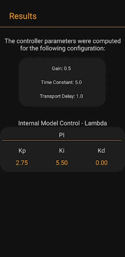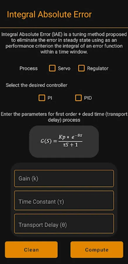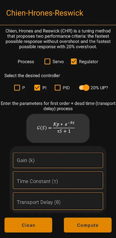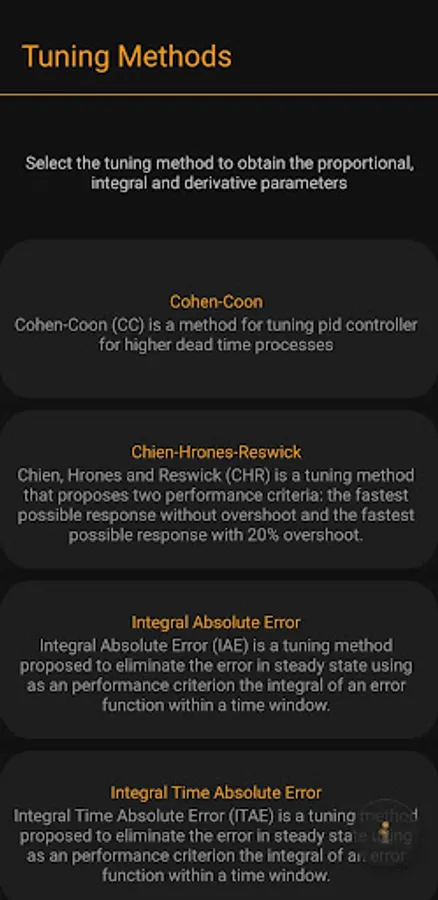 Ziegler-Nichols (Z&N), Chien, Hrones e Reswick (CHR), Cohen-Coon (CC), Internal Model Control (IMC), Integral of Absolute Error (IAE) and Integral of Time-Weighted Absolute Error (ITAE) methods¹ are available to calculate the controller parameters (Proportional, Integral and Derivative) using the process parameters Gain, Time Constant and Dead Time (Transport Delay).