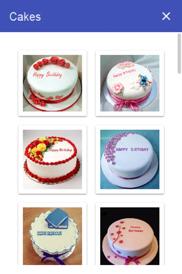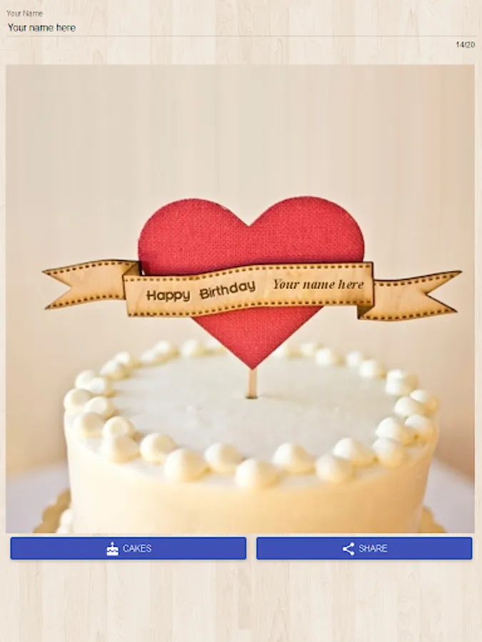 Select a cake image from the gallery of cakes and just write birthday person's name on it and click share through Whatsapp, Gmail, ShareIt, Facebook etc..