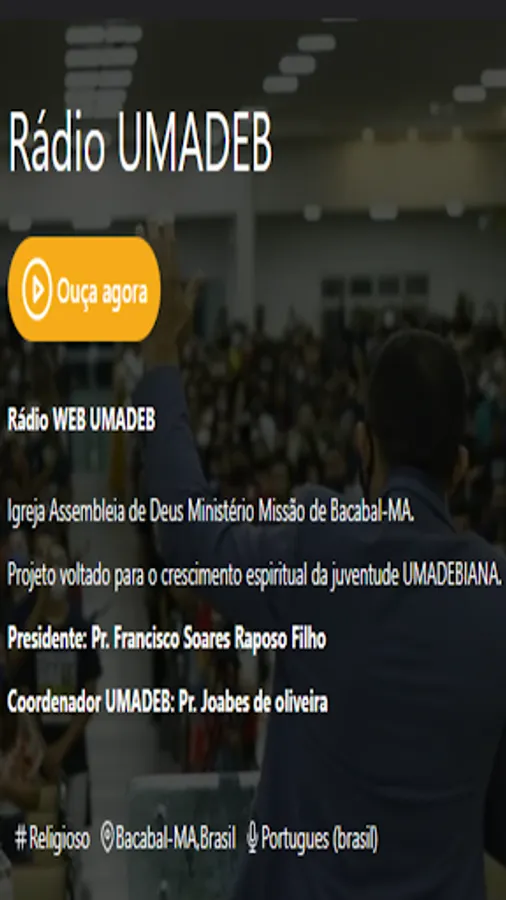 Radio UMADEB of the Church Assembly of God CEADEMA, project of the youth union of Bacabal Maranhão, with Pastor Joabes Oliveira as coordinator, and President Francisco Raposo Soares.