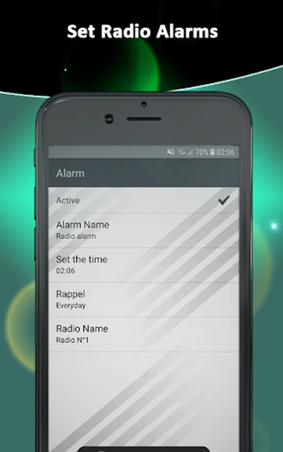 - The radio app with alarm allows you to start the alarm with your favorite radio station