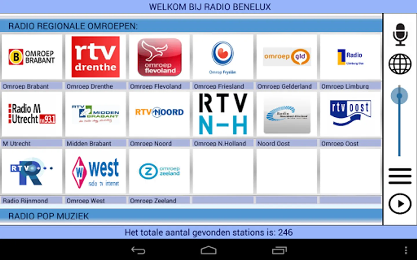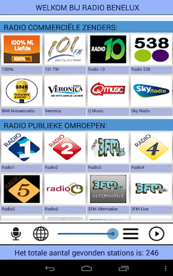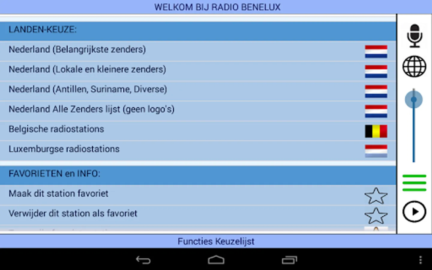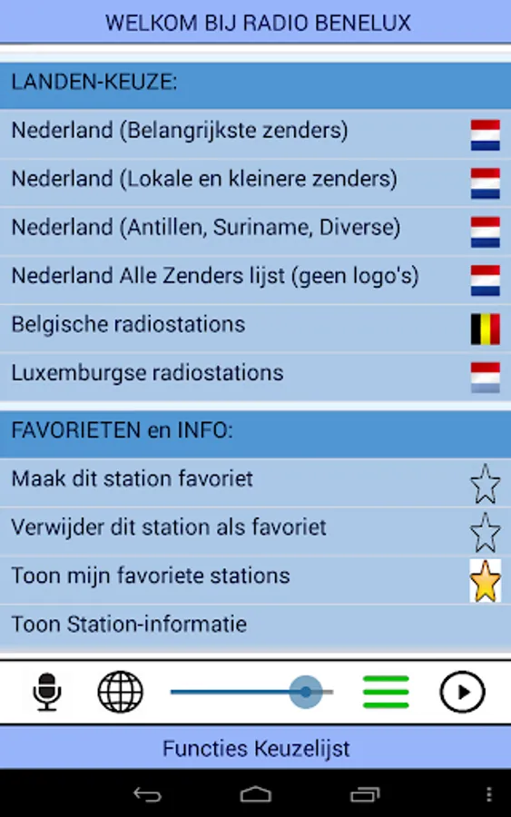 This app receives radio stations from the BeNeLux: Belgium, The Netherlands and Luxembourg.