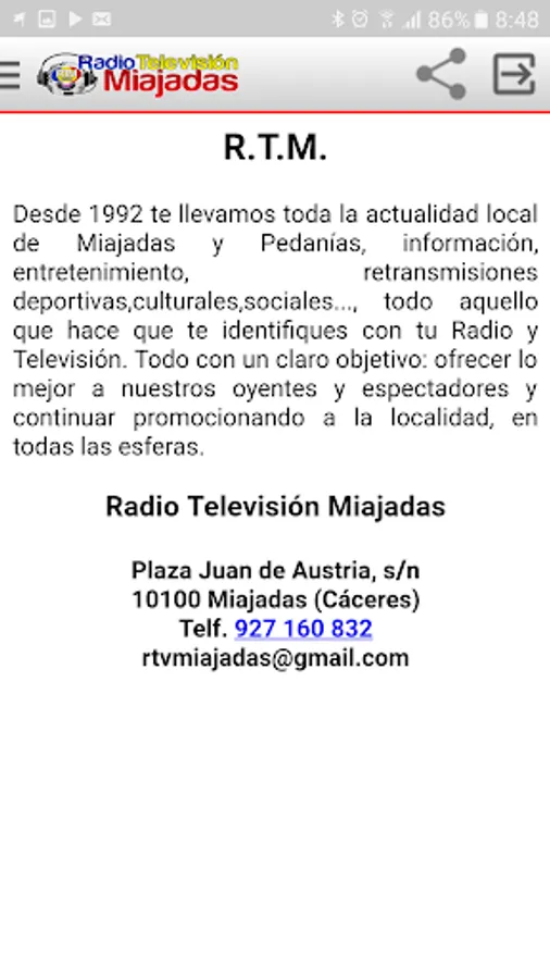 Since 1992 we take all the local news of Miajadas and districts, information, entertainment, sports, cultural, social ... retransmissions, everything that makes you identify with your Radio and Television. All with a clear objective: to offer the best to our listeners and viewers and continue to promote the town, in all spheres.