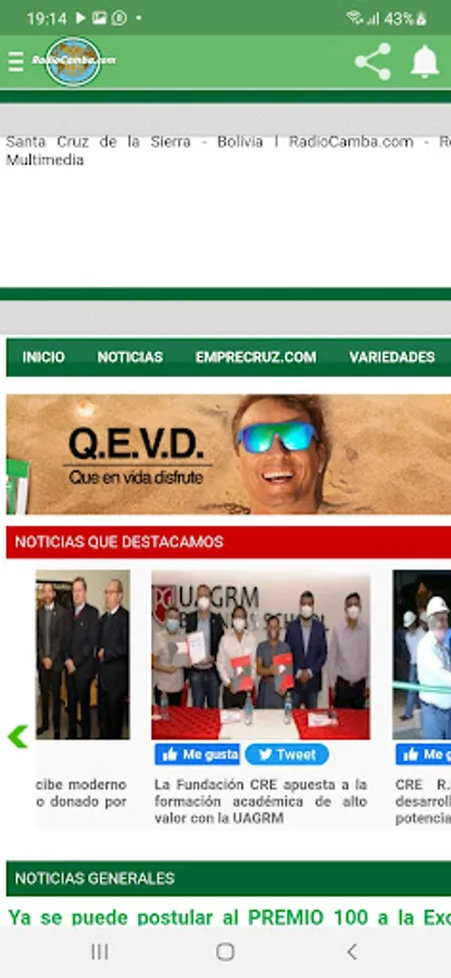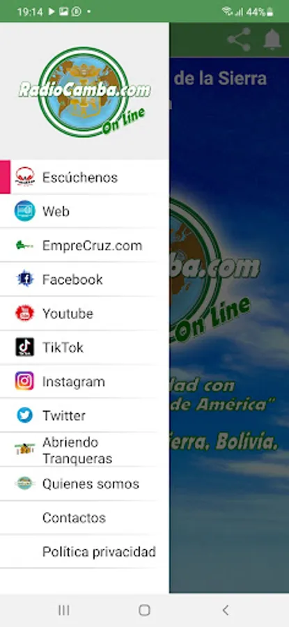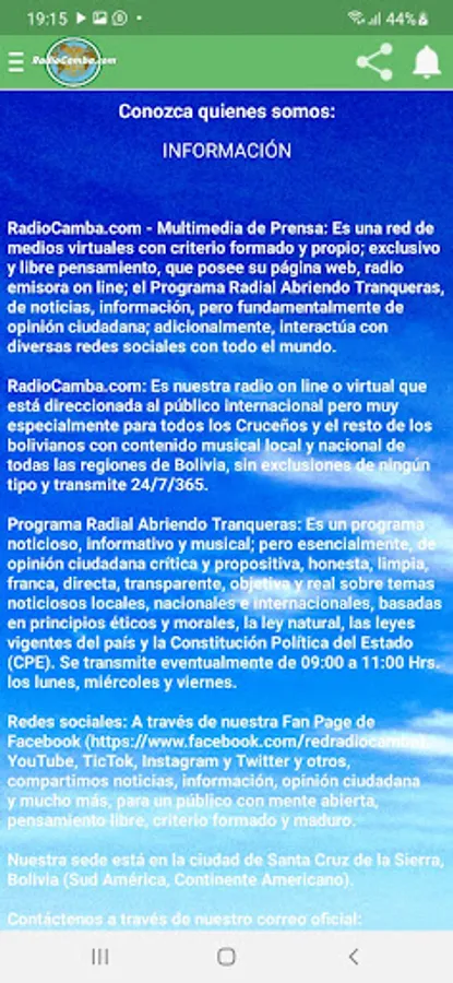RadioCamba.com: It is our online or virtual radio that is aimed at the international public but especially for all Cruceños and the rest of Bolivians with local and national musical content from all regions of Bolivia, without exclusions of any kind and transmits 24/7/365.