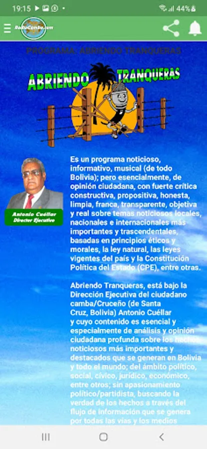 Radial Program Opening Tranqueras: It is a news, informative and musical program; but essentially, of critical and purposeful citizen opinion, honest, clean, frank, direct, transparent, objective and real on local, national and international news topics, based on ethical and moral principles, natural law, the current laws of the country and the Political Constitution of the State (CPE). It is broadcast eventually from 09:00 to 11:00 Hrs. on Monday, Wednesday and Friday.