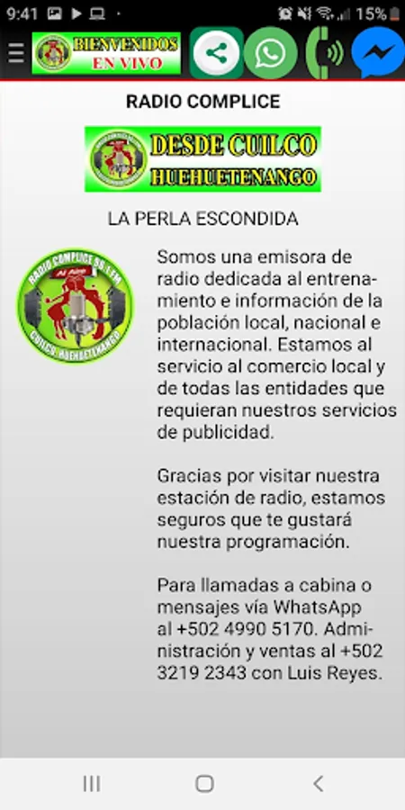 For cabin calls or messages via WhatsApp at +502 4990 5170. Administration and sales at +502 3219 2343 with Luis Reyes.