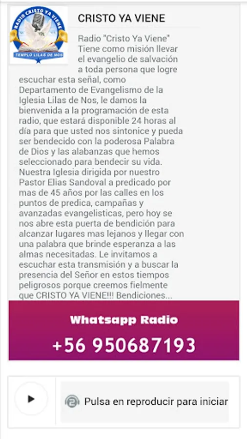Radio "Christ is Coming" Its mission is to bring the gospel of salvation to everyone who can hear this signal, as the Evangelism Department of the Lilas de Nos Church, we welcome you to the programming of this radio, which will be available 24 hours a day for you to tune in and be blessed with the powerful Word of God and the praises that we have selected to bless your life. Our Church directed by our Pastor Elías Sandoval has preached for more than 45 years in the streets at the preaching points, campaigns and evangelistic outposts, but today this door of blessing is opened to us to reach more distant places and arrive with a word that offers hope to souls in need. We invite you to listen to this broadcast and seek the presence of the Lord in these dangerous times because we faithfully believe that CHRIST IS COMING!!! Blessings...