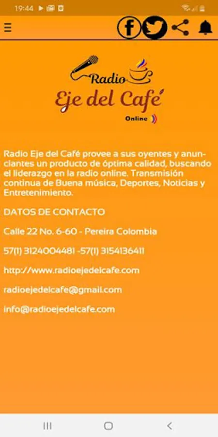 Radio Eje del Cafe is a station created for demanding listeners as it transmits the best musical successes, ballads of memories, romantic salsa, old-fashioned hits, boleros, popular music and those songs that make us remember and live, in addition to transmitting sporting events in I live from the locations where the games are played directly. We are a team with great experience in radio communications both in current news and entertainment. We have excellent sound quality and excellent programming.