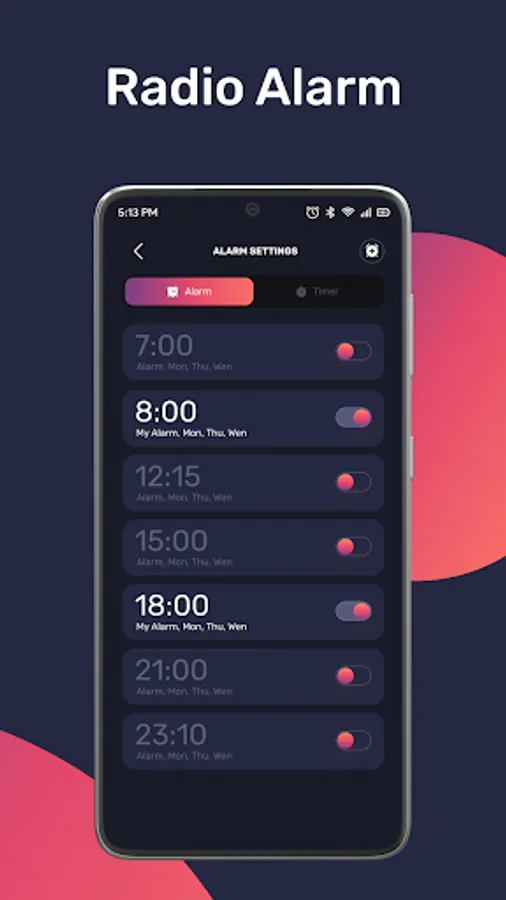 🎧 Alarm Clock: the app will ask you to indicate the radio station that you want to listen to as you wake up