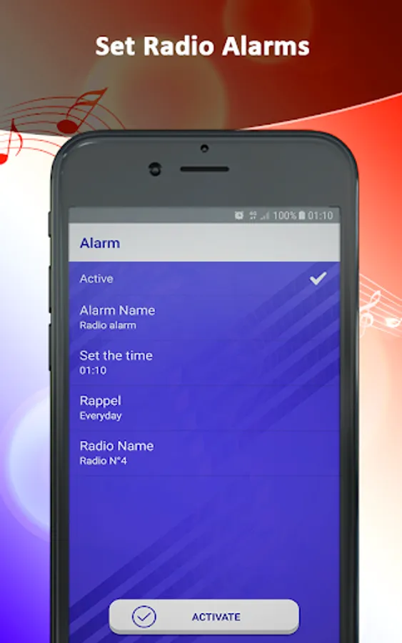 - The radio app with alarm allows you to start the alarm with your favorite radio station