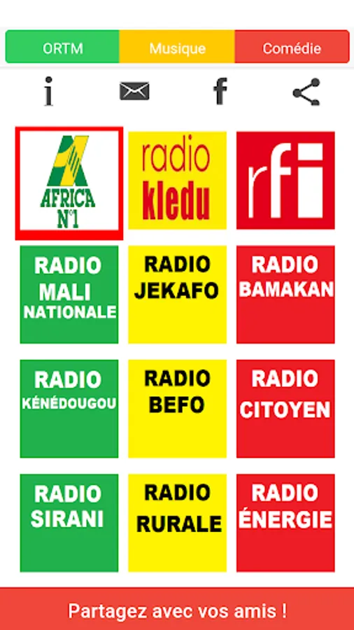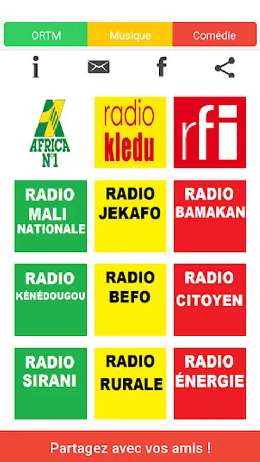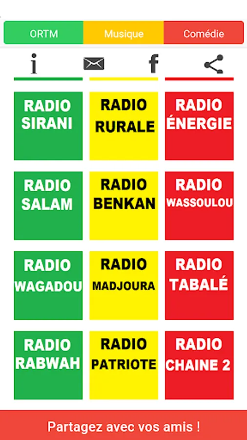 The radios of all the regions of Mali are on our mobile application: Bamako, Kayes, Koulikoro, Sikasso, Ségou, Mopti, Tombouctou, Gao, Kidal, Menaka and Taoudeni.