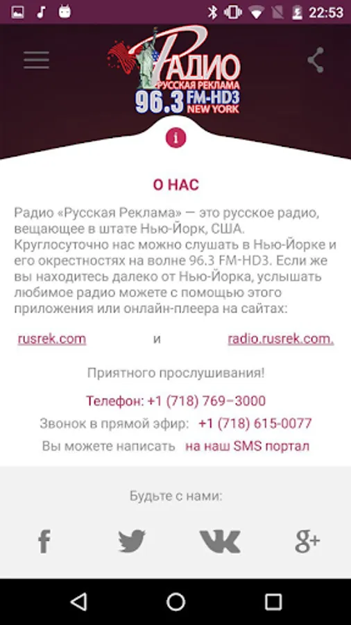 Radio Russkaya Reklama (Rusrek) — it’s a Russian radio located in New York, USA. We will inform you about the latest music events, world and US news, entertainment and traffic information, jokes and showbiz news. Russian radio broadcasts 24/7. You can listen to our radio in New York and the surrounding areas on the 96.3 FM-HD3 channel. If you’re away from New York City — you can listen to us with this application or online players on the websites www.rusrek.com and radio.rusrek.com and wherever there is an Internet connection. Online broadcast of radio show available on our official Facebook page www.facebook.com/RadioRusskayaReklama. Enjoy our radio!