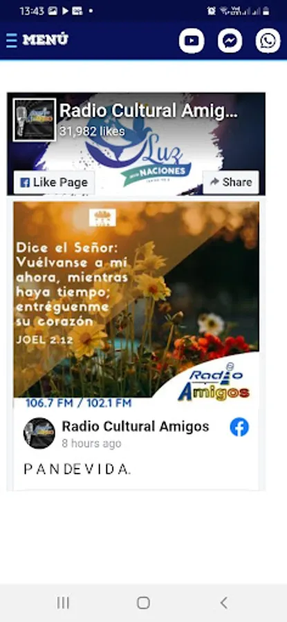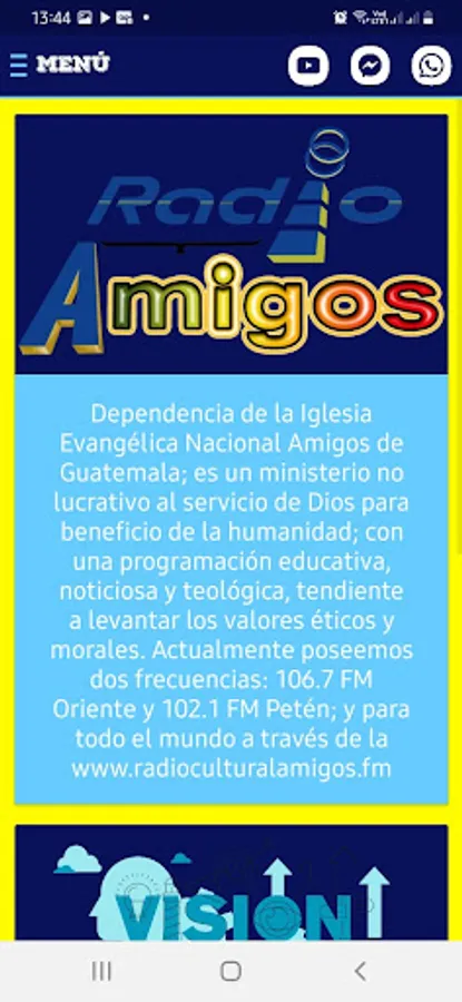 Unit of the National Evangelical Church Friends of Guatemala; It is a non-profit ministry at the service of God for the benefit of humanity; with an educational, news and theological programming, aimed at raising ethical and moral values. We currently have two frequencies: 106.7 FM Oriente and 102.1 FM Petén; and for everyone through www.radioculturalamigos.fm