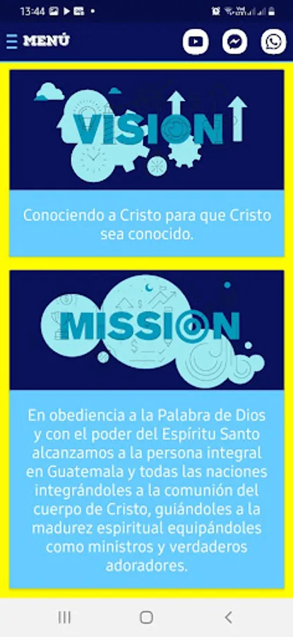 In obedience to the Word of God and with the power of the Holy Spirit, we reach the whole person in Guatemala and all nations, integrating them into the communion of the body of Christ, guiding them to spiritual maturity, equipping them as ministers and true worshipers.