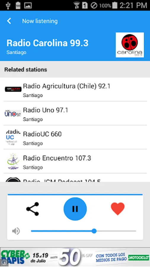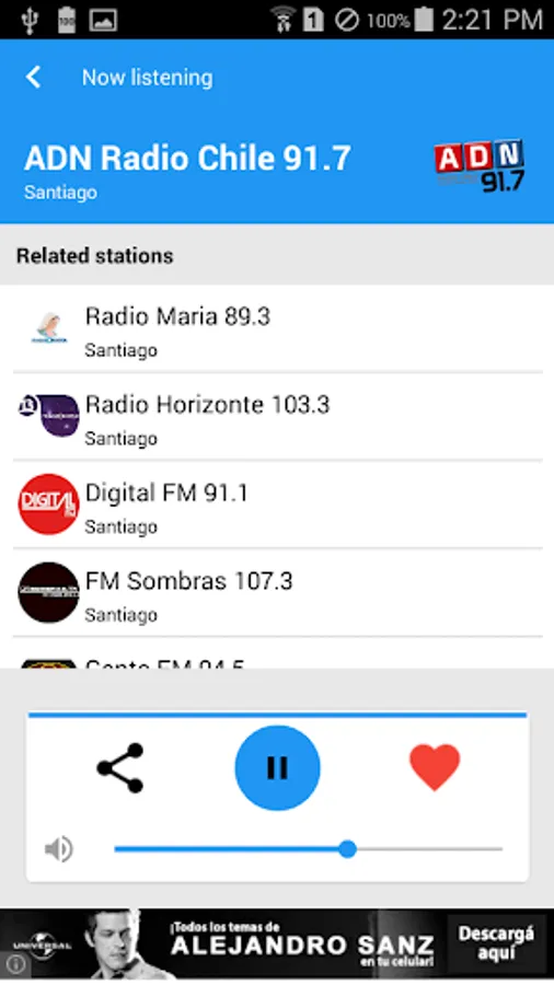 Radio Chile is a great app for listening all the radio stations from Chile on your Android. This app is really easy to use and it's very fast. You can stream your favorite radio channel at any time. You will be really happy with this app, try it!