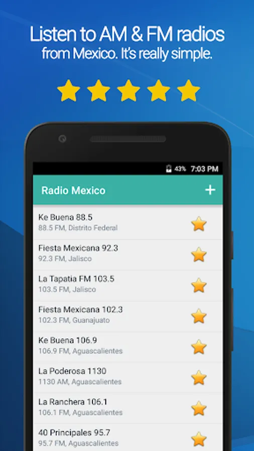 This is the most simple, fast and clear app for listening all the radio stations from Mexico, all mexican radio. We have one of the most complete stations list of mexican stations and we are sure you will find the mexico stations you are looking for.