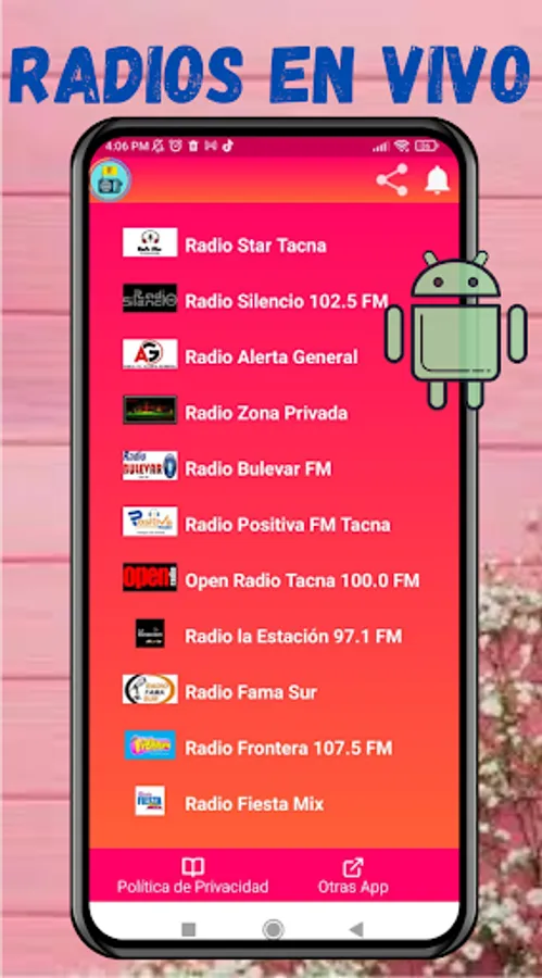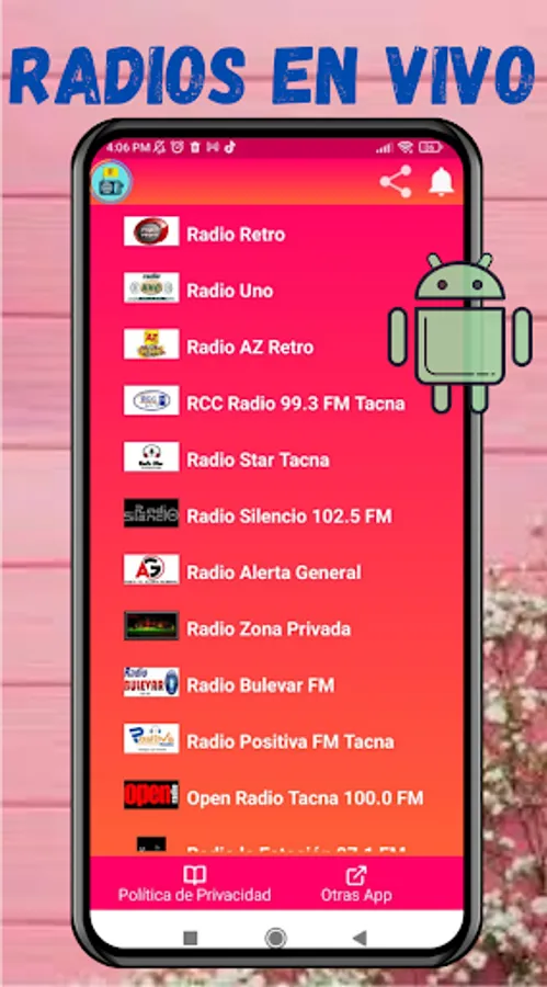 This Tacna Radios Application contains the most current online radio stations of the heroic city of Tacna, and you can enjoy it from your mobile device with an Android operating system for free.