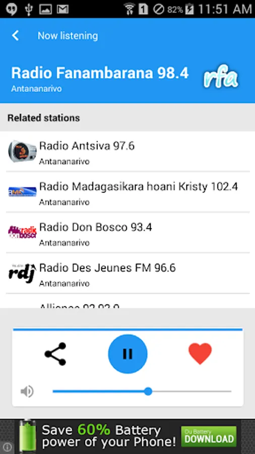 Radio Madagascar is a great app for listening all the radio stations from Madagascar on your Android. This app is really easy to use and it's very fast. You can stream your favorite radio channel at any time. You will be really happy with this app, try it! Listen to AM, FM, music, sports, news, talk and much more! Madagasikara Radio