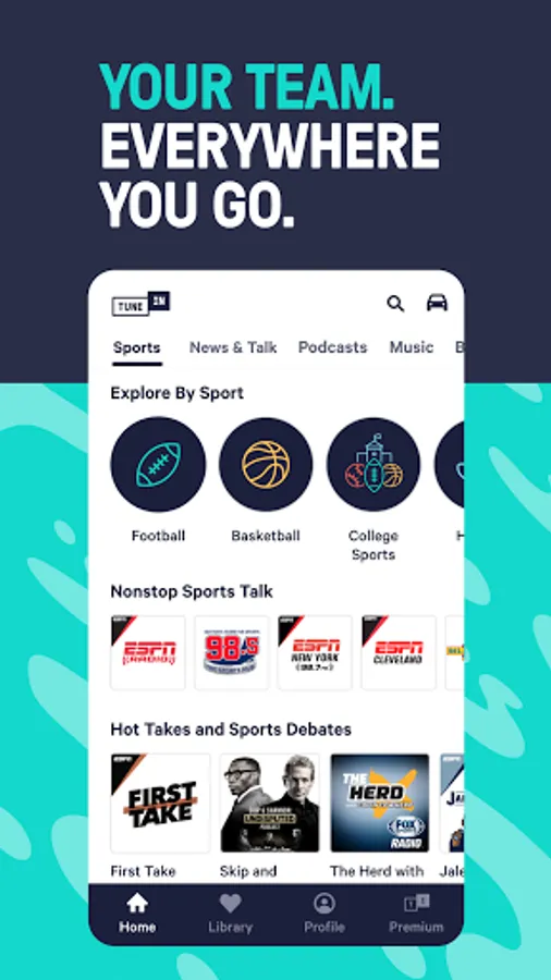 Fuel your fandom with live play-by-play of NFL, NHL, and college football and basketball. Plus, hear endless news, analysis, and fan discussions from sports talk stations like ESPN Radio and talkSPORT. And, receive gametime notifications and customized content when you pick your favorite teams on the app. Plus, listen to on-demand podcasts covering your football, baseball, basketball, and hockey obsession from every angle.