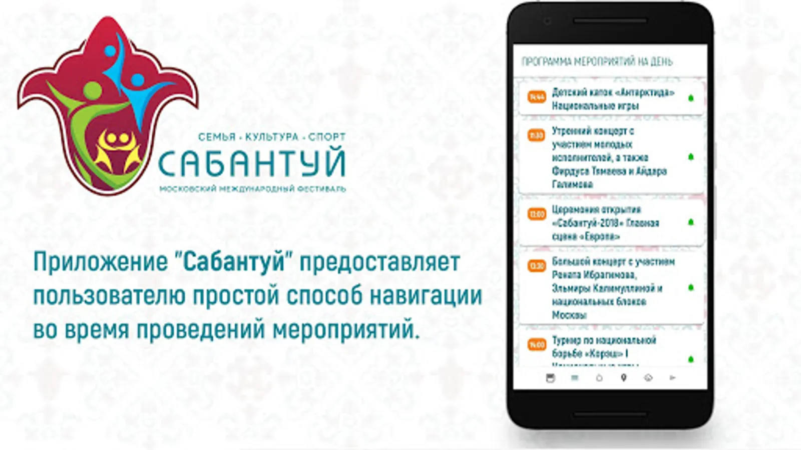 The application "Sabantuy" provides the user with an easy way to navigate during events. If during Sabantui you have difficulties in navigation, this application is for you. It includes many features for your simple and active recreation. In the application, you can receive the latest news about Sabantui, find out the program of events for the whole festive day, as well as get more recent information about it. On the map tab, you can easily determine the location of the event. Tab records in the nursery, will help you leave your child for the duration of the events.