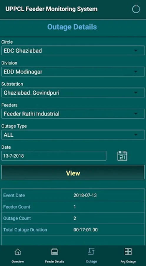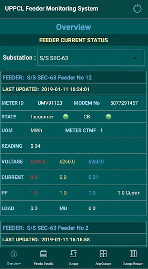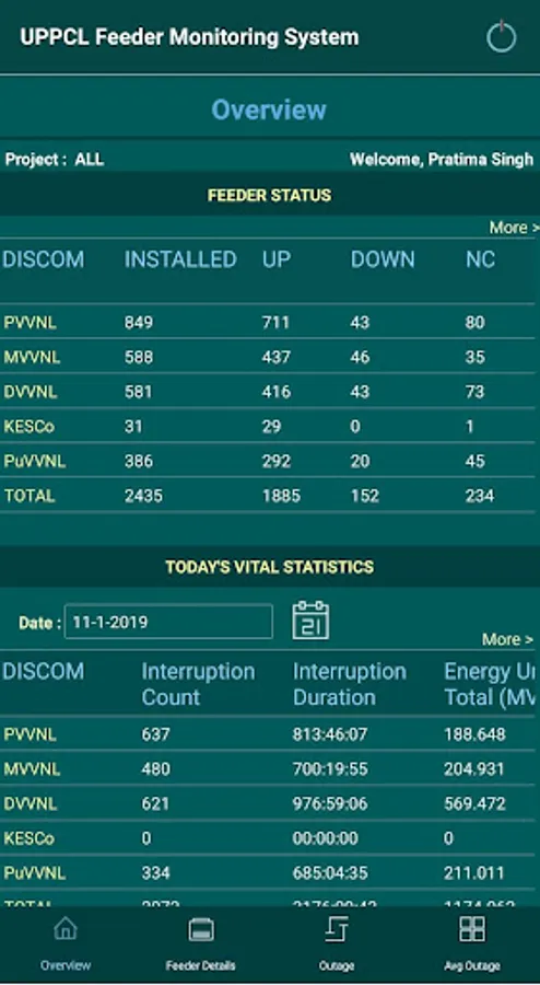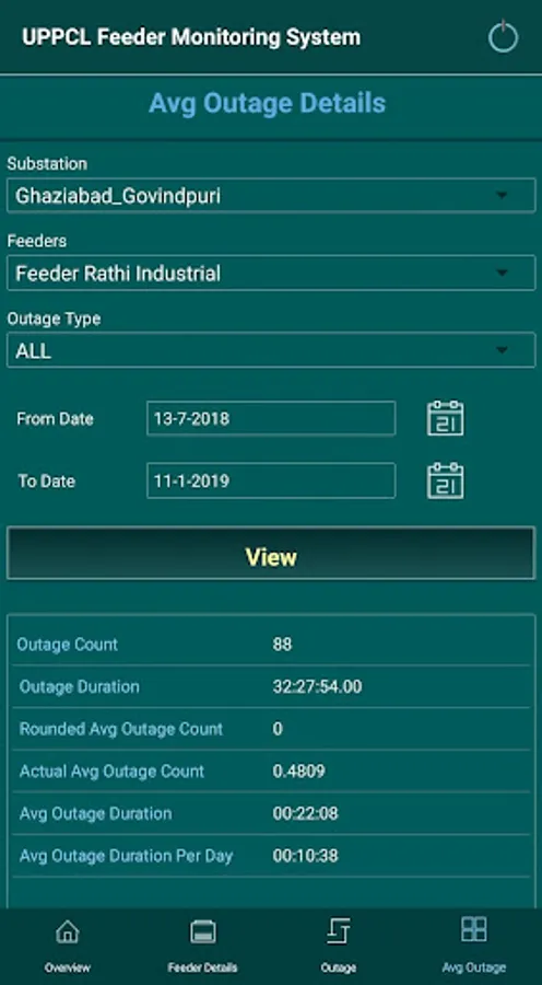 -> Overview: Contain current up, down status of Feeder and Interruption count, duration and energy unit losses of feeder based on Date and Month.