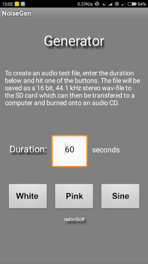 Generates very high quality, red book compatible wav files with white and pink noise as well as sine sweeps 20 Hz to 20 kHz that can directly be burned onto an audio CD.