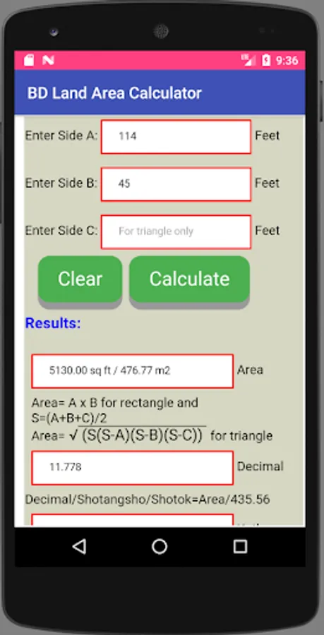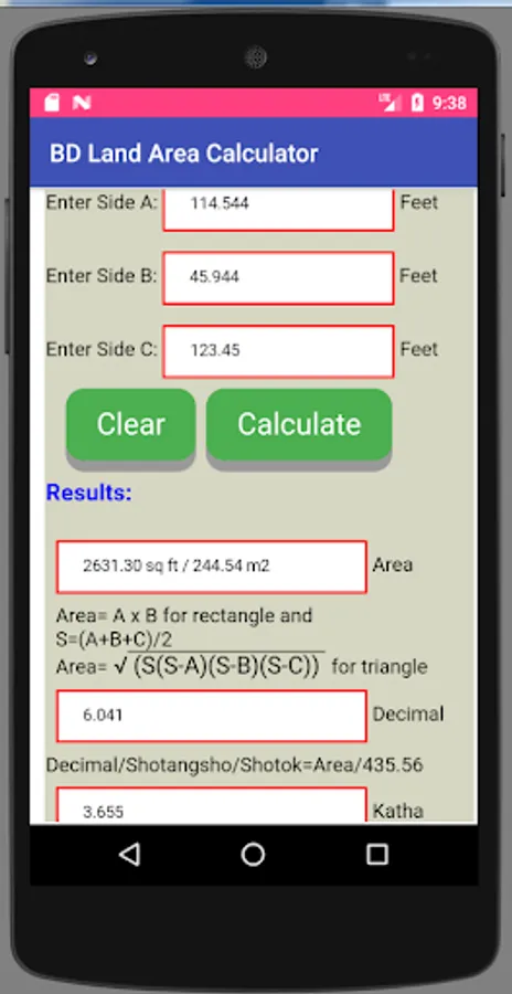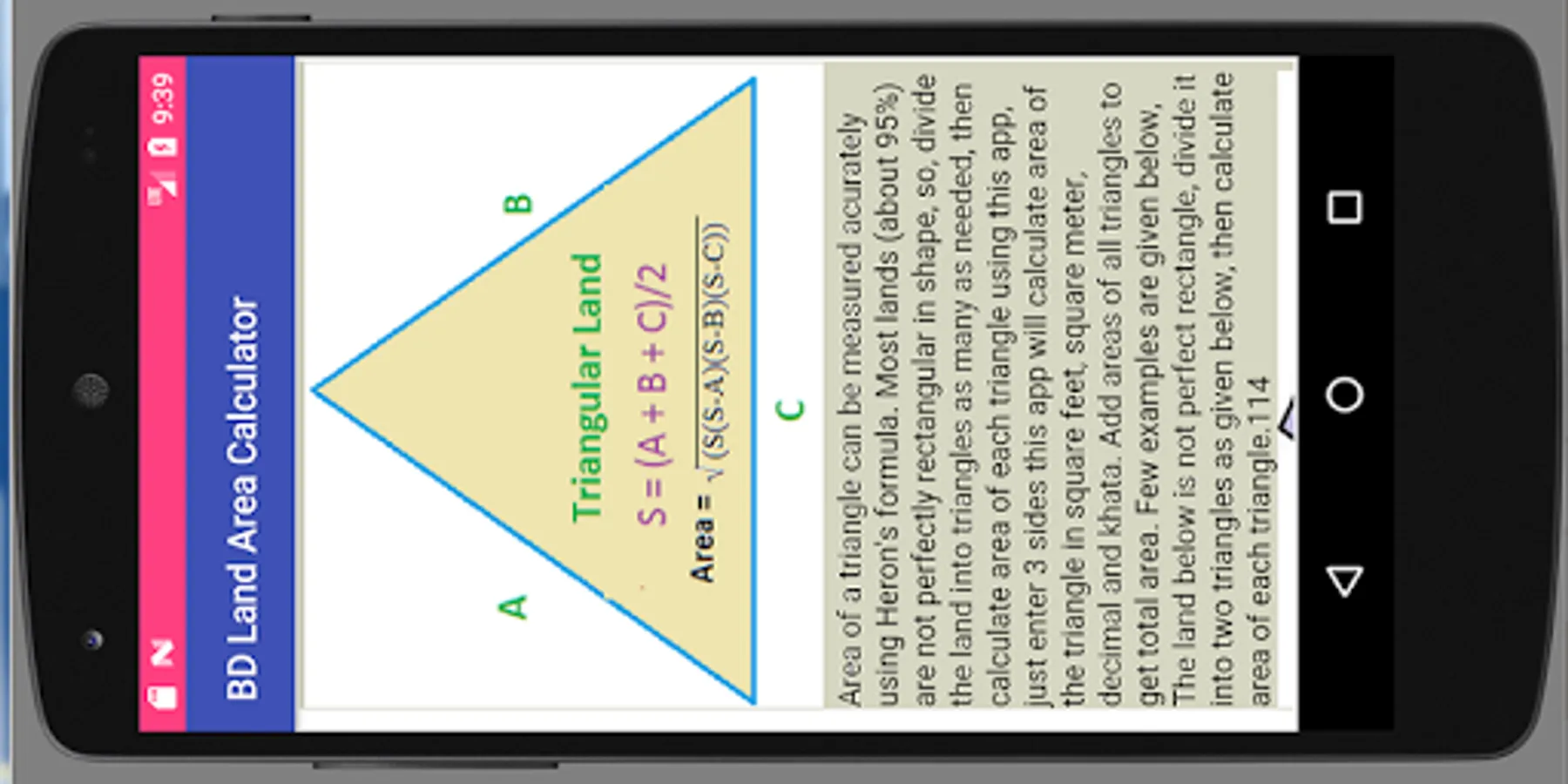 This app will calculate land area in square feet, square meter, Decimal and in Katha using well known Heron's formula.